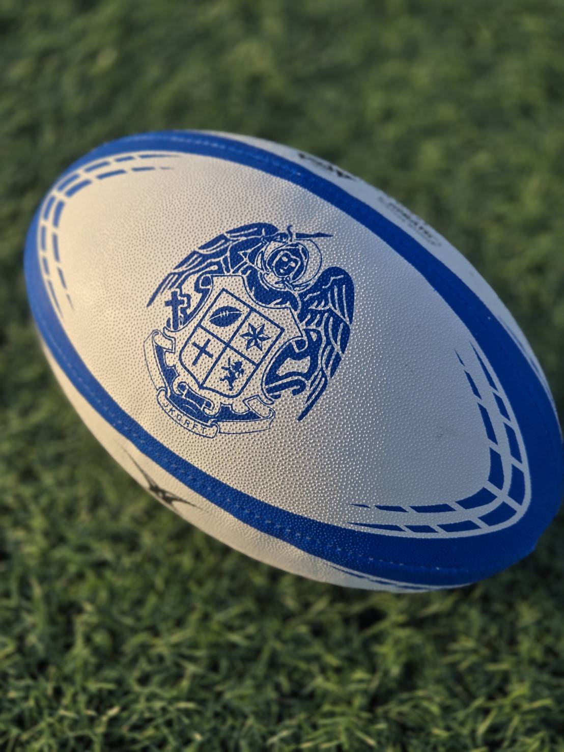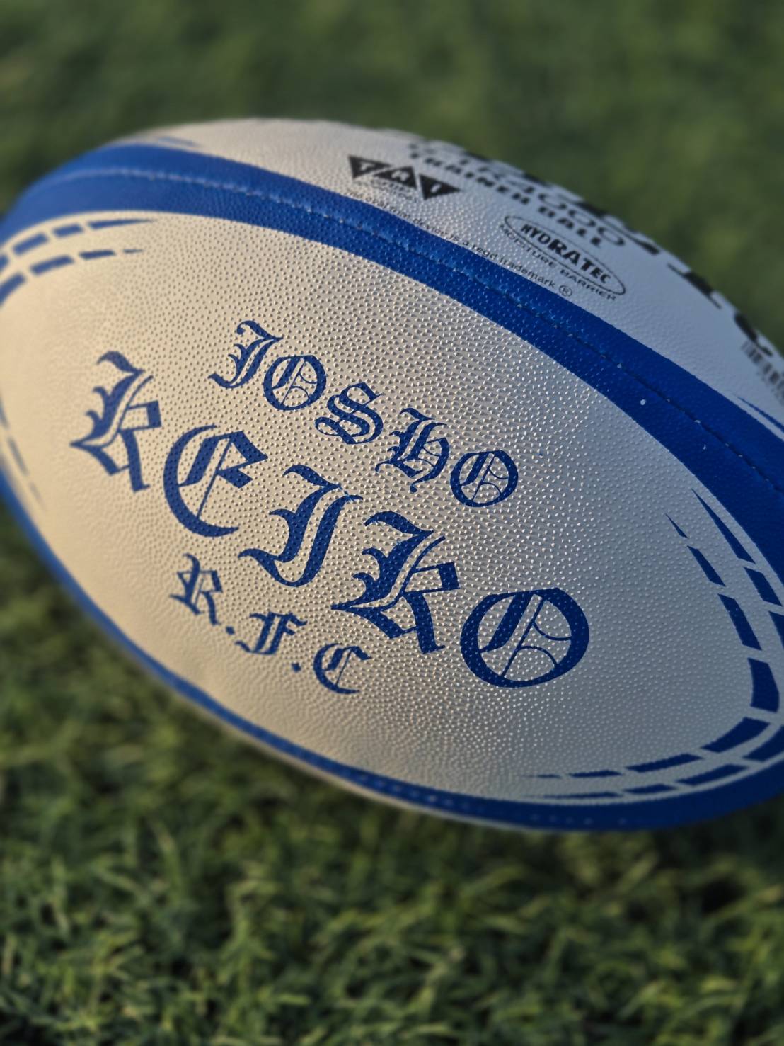 一面にはエンブレム、もう一面には「JOSHO KEIKO R.F.C.」の文字をオールドイングリッシュ体で刻印。チームのアイデンティティをそのままボールに落とし込んだ、価値ある一球です。