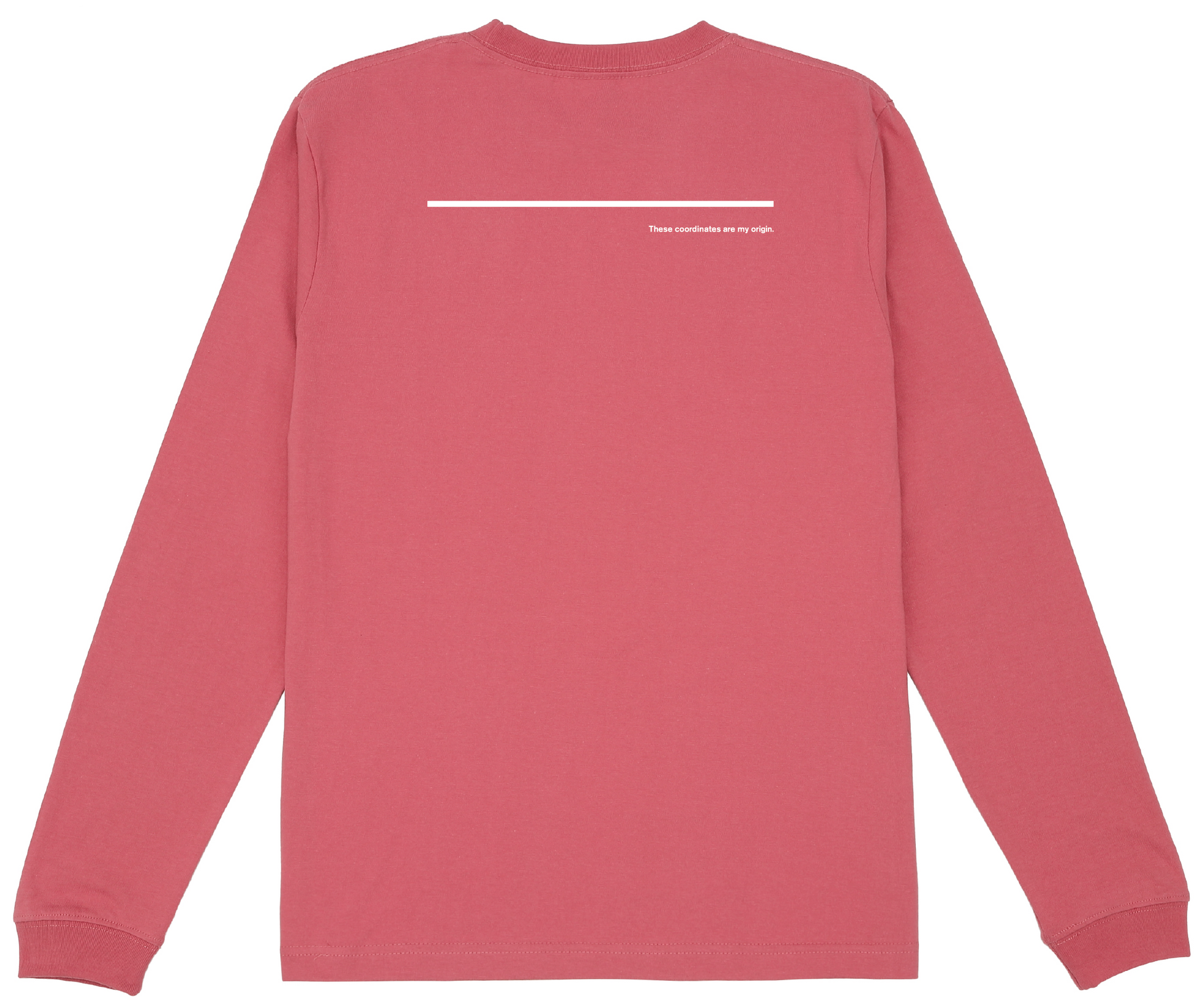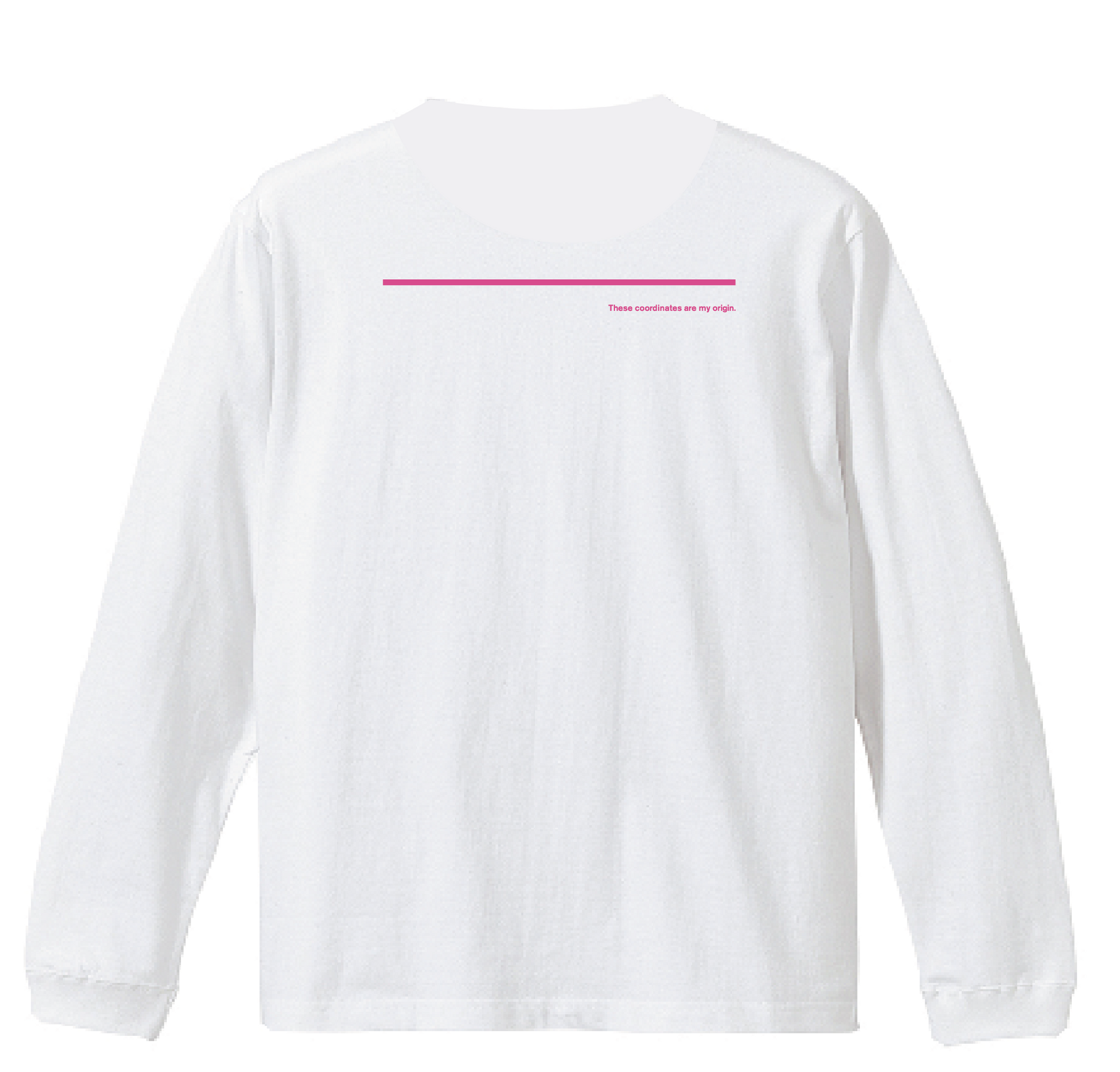 左胸にさりげなく刻まれた縦組みの座標、背面には静かに一言——「These coordinates are my origin.」